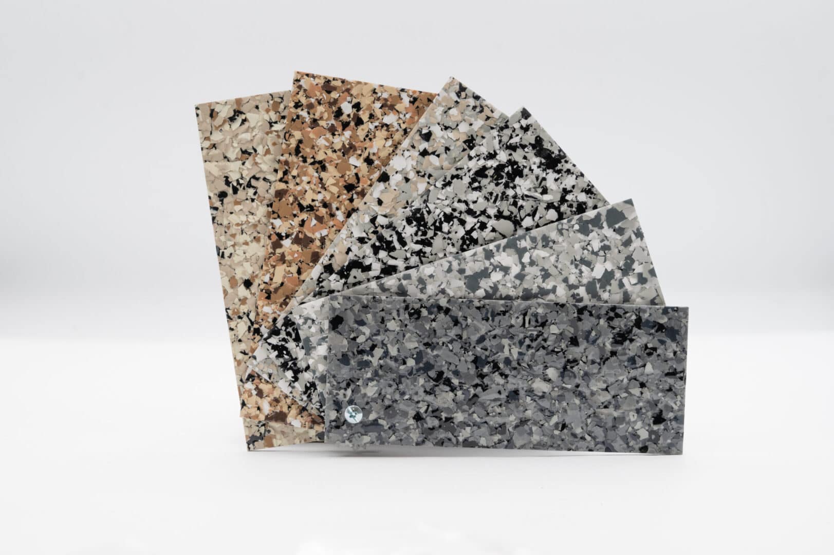 Resinous decorative coatings, Flake and Quartz blend matching for competitive job needs. Metallic Epoxy Floor applications.